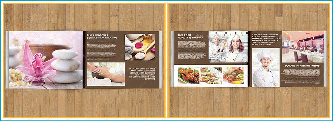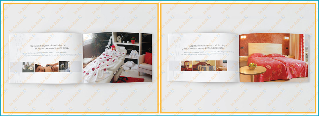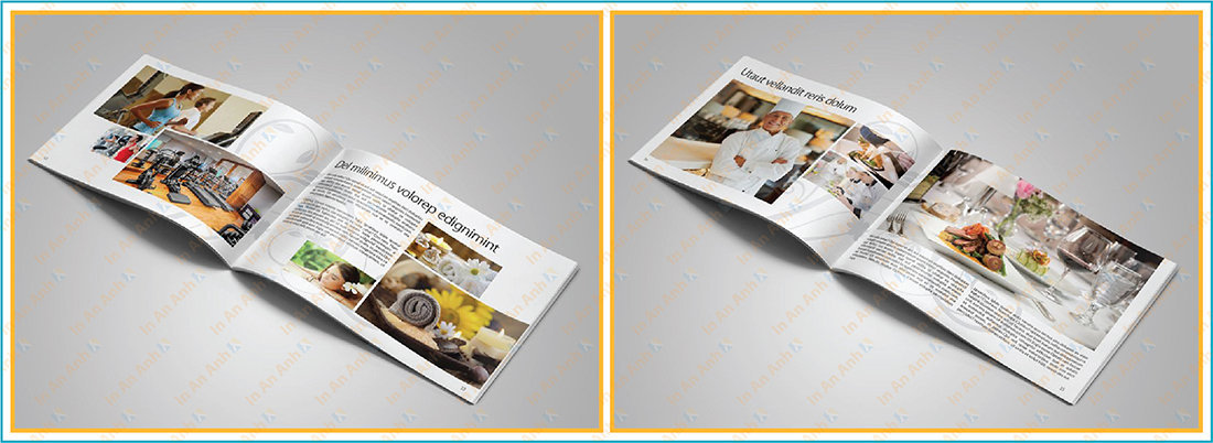 Không chỉ có hình ảnh nội thất, những hình ảnh liên quan đến các loại sản phẩm, dịch vụ spa, giải trí cũng được lồng ghép rất nhiều trong các cuốn catalogue