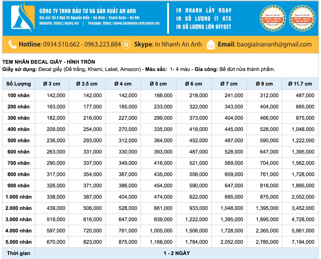 In An Anh chuyên cung cấp dịch vụ in tem nhãn mác dán sản phẩm số lượng ít lấy nhanh trong ngày. Đáp ứng tốt nhu cầu đặt in tem nhãn lấy ngay tại Hà Nội trong vòng 24h. Chỉ với 799.000 vnđ bạn sẽ sở hữu ngay 3000 tem nhãn tròn đường kính 5cm. Nếu bạn có nhu cầu in ấn số lượng lớn, lấy gấp trong ngày hãy liên hệ ngay với số hotline: 0963.223.884 để được tư vấn và nhận báo giá tốt nhất.