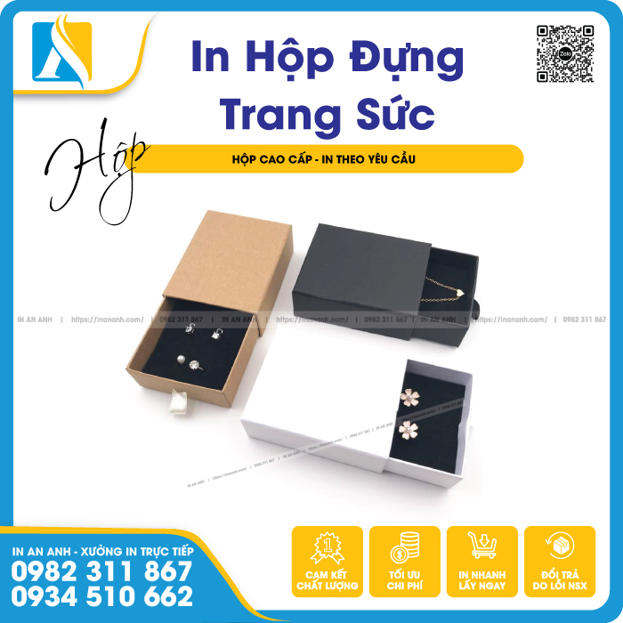 In An Anh cung cấp dịch vụ in hộp trang sức chuyên nghiệp, đáp ứng mọi nhu cầu và yêu cầu riêng của khách hàng. Chúng tôi cam kết mang đến những sản phẩm chất lượng cao với giá thành hợp lý, giúp bạn tạo ấn tượng mạnh mẽ cho thương hiệu của mình. Chúng tôi cung cấp nhiều loại hộp đựng bằng chất liệu đa dạng như giấy, carton, và các vật liệu thân thiện với môi trường giúp thương hiệu của bạn dễ dàng gây ấn tượng hơn với khách hàng.