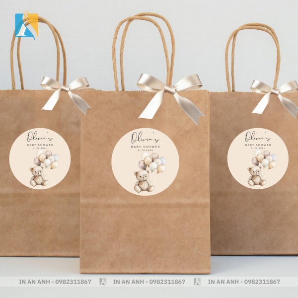 Túi giấy kraft quai xoắn, gắn nơ ruy băng và in nhãn mác tròn gấu bông