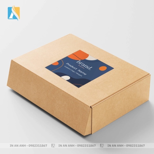 Hộp giấy kraft nắp gài với tem nhãn in màu hiện đại, thiết kế tối giản và sang trọng