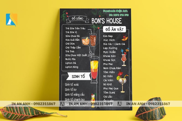 Đối với quán cafe, menu A4 (21 x 29.7 cm) là lựa chọn phổ biến nhất vì gọn gàng, dễ cầm. Trong khi đó, các quán trà sữa thường kết hợp cả khổ A4 và A5 (14.8 x 21 cm) để in menu để bàn hoặc menu cầm tay. Thiết kế này vừa tiết kiệm chi phí vừa giúp khách dễ chọn món, đặc biệt phù hợp với không gian trẻ trung, hiện đại.