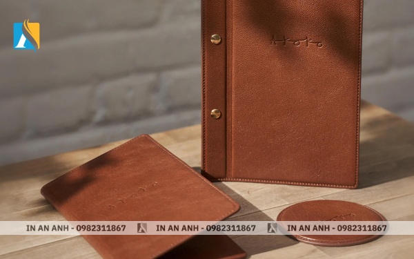 Menu bìa da thường sử dụng trong các nhà hàng cao cấp, tiệc cưới hoặc khách sạn. Chất liệu da tạo sự bền đẹp và ấn tượng. Các kích thước phổ biến là 21 x 29.7 cm, 18 x 21 cm hoặc 18 x 29.7 cm.