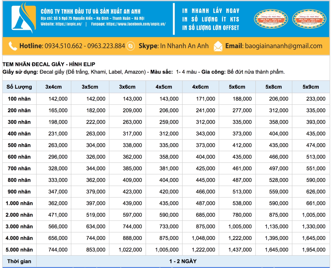 In nhãn mác Anpic chuyên cung cấp dịch vụ in nhãn mác dán sản phẩm số lượng ít lấy nhanh trong ngày. Đáp ứng tốt nhu cầu đặt in tem nhãn lấy ngay tại Hà Nội trong vòng 24h. Chỉ với 999.000 vnđ bạn sẽ sở hữu ngay 4000 tem hình elip kích thước 4x6cm. Nếu bạn có nhu cầu in ấn số lượng lớn, lấy gấp trong ngày hãy liên hệ ngay với số hotline: 0967 10 70 75 để được tư vấn và nhận báo giá tốt nhất.